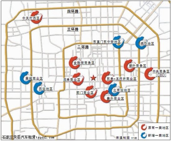 此次对一类地区范围进行了调整,新增了北京站地区、西站地区、东直门东中街地区、燕莎地区、翠微商业区等5个区域,并扩大了原有的东单-王府井商业区、前门商业区、中关村西区、西单商业区、朝外商务区、中央商务区(CBD)、金融街商务区、崇外商业区等8个重点区域中后7个地区的四至范围。调整后,一类地区的个数由8个增加到13个。