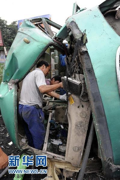 8月1日,工人在清理事故中损坏的车辆。当日16时30分许,河北省元氏县发生重大交通事故,一煤场工人驾驶的铲车冲撞多辆汽车,已造成20多人伤亡,其中8人死亡。